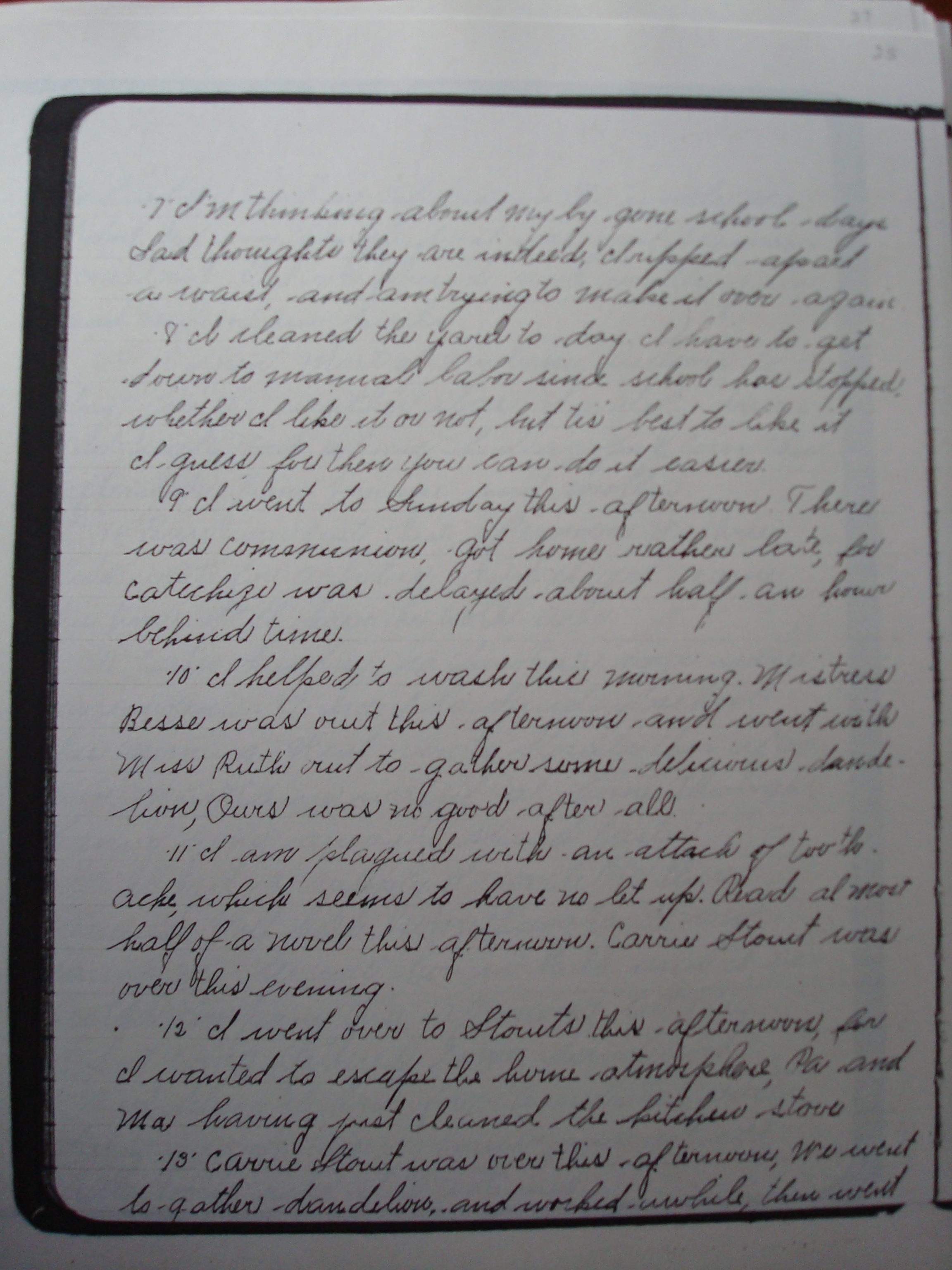 Based upon this entry it sounds like Grandma participated in three distinct activities at church—Sunday school, a catechism class that was preparing her to join the church, and the mention of communion suggests that she also attended the main church service. I’m surprised that Sunday school was held in the afternoon. Maybe there were several churches in the parish and the minister rode the circuit between them, with some services being held in the afternoon.