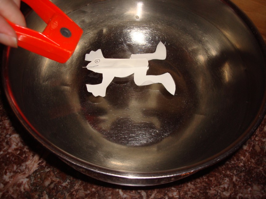 After the paste or glue dries fill a bowl or pan with water, then set the frog down on top of the water. Hold the magnet near the pin in the frog’s mouth.