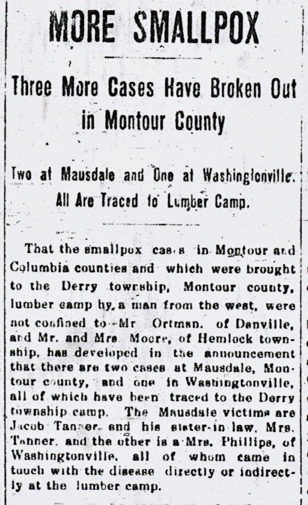 In January 1911 there were smallpox outbreaks in two nearby towns (Washingtonville and Mausdale) located about 15 miles east of the Muffly farm.