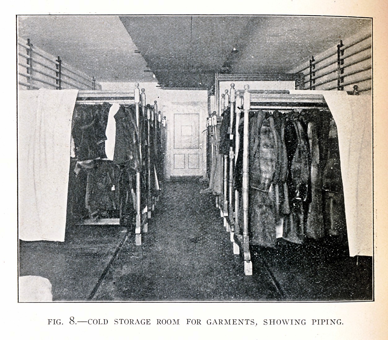I don’t understand exactly how cold storage rooms were kept cold, but the rooms probably were cooled by pipes filled with brine or ammonia. Compression machines may have been used. There were a number of different methods described in a 1905 book, but a common method is described below: