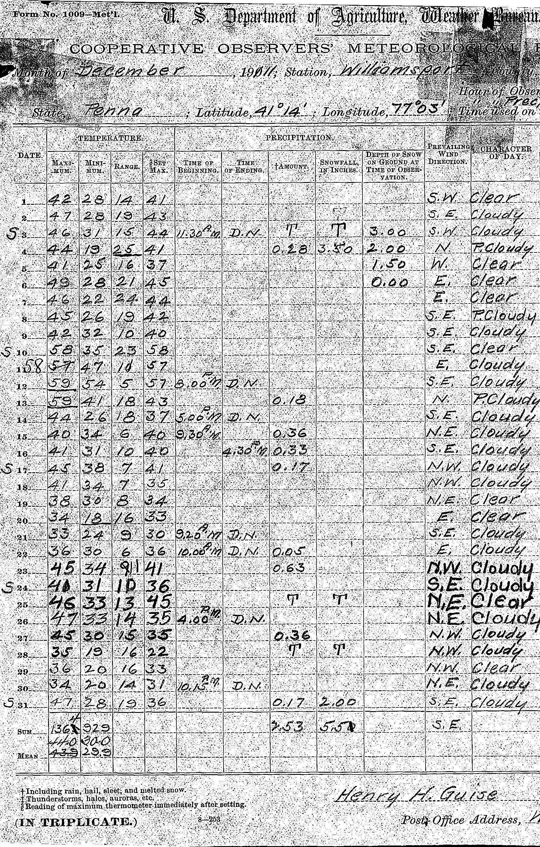 It sounds like a blustery winter day. I found the weather data for December, 1911 for Williamsport, Pennsylvania on the National Climatic Data Center website.