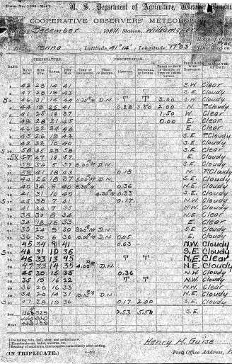 On the page that the link goes to, scroll down to “Most Requested B” and click on “Individual Station Original.” Then select the state that you are interested in. The names of lots of weather stations in the state will appear. Scroll down to the city you are interested in. Some cities are listed several times because there are different weather data series for that city. For example, Williamsport PA is listed three times. I wanted the series that included 1911, so I selected the one that said, “Williamsport 1895-02 -1977-09.” This means that there is weather data from February (02), 1895 through September (09), 1977. The next screen then lists the years and months. To get the original form that I posted, I selected on “1911-12” (December 1911).