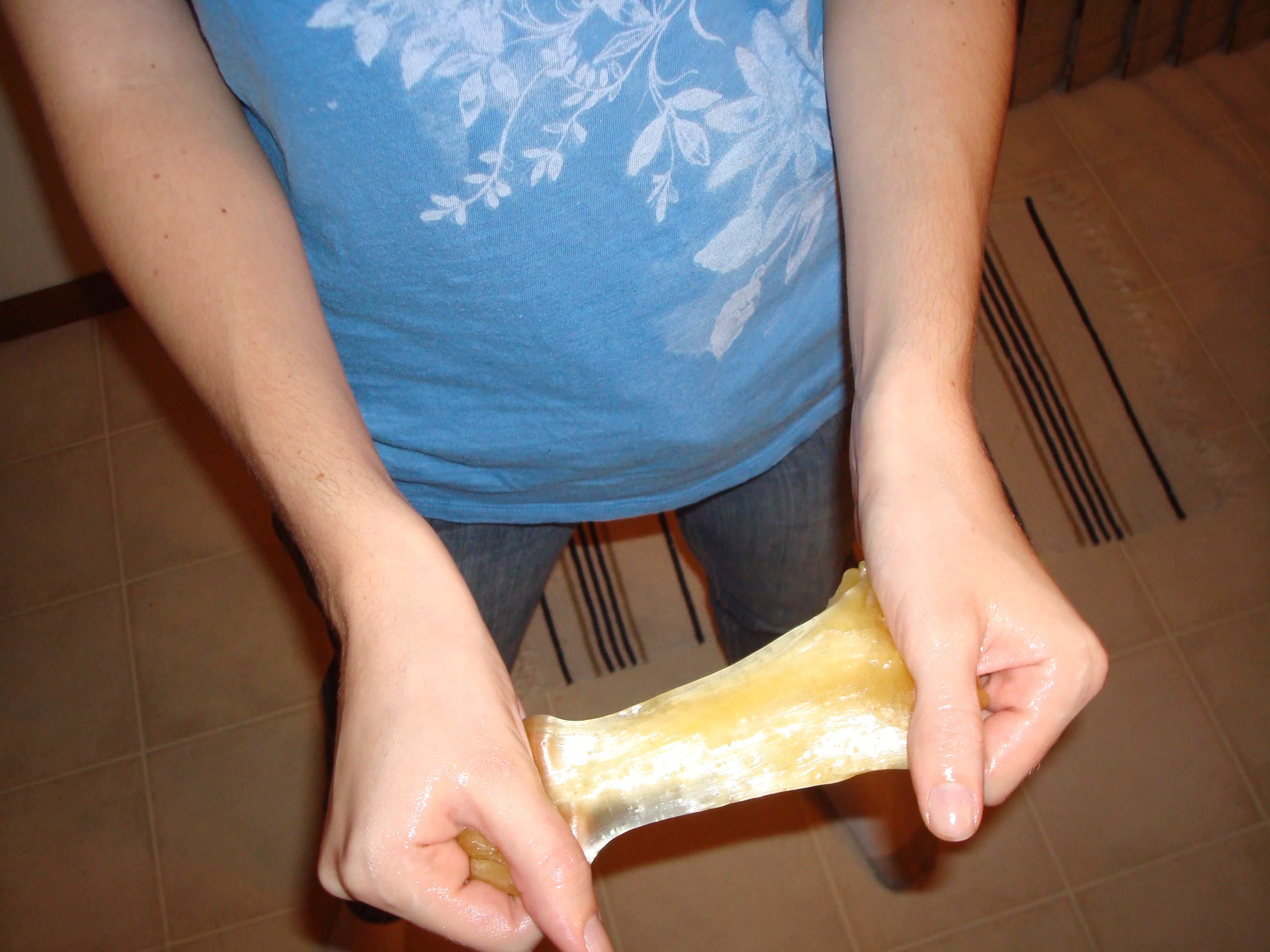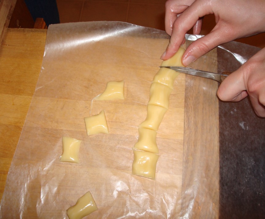 We then buttered our hands and pulled the candy until it became creamy and glossy (about 5 minutes). We formed ropes of candy on a piece of waxed paper; then cut with a knife that we periodically dipped in hot water.