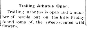 I even noticed a short article about arbutus when I was recently looking through microfilms of the local newspaper. The April 8, 1912 issue of the Milton Evening Standard had the following article: