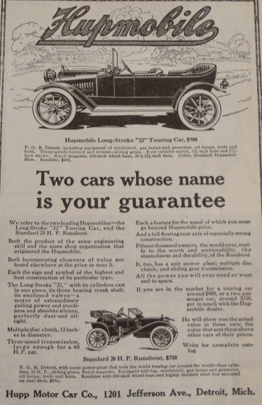 We refer to the two leading Hupmobiles—the Long-Stroke “32” Touring Car, and the Standard 20 H.P. Runabout.