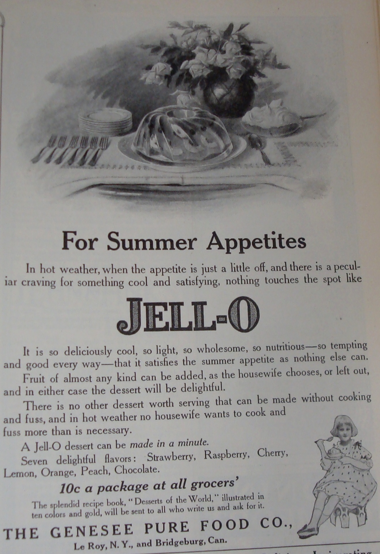 1. Thanks for this great post. You inspired me to look up a little bit more about Jell-O. They first started advertising in the Ladies Home Journal in 1902, so this was definitely in the early days. Can you imagine Chocolate Jell-O? Evidently it wasn’t too popular as it was discontinued in 1927.