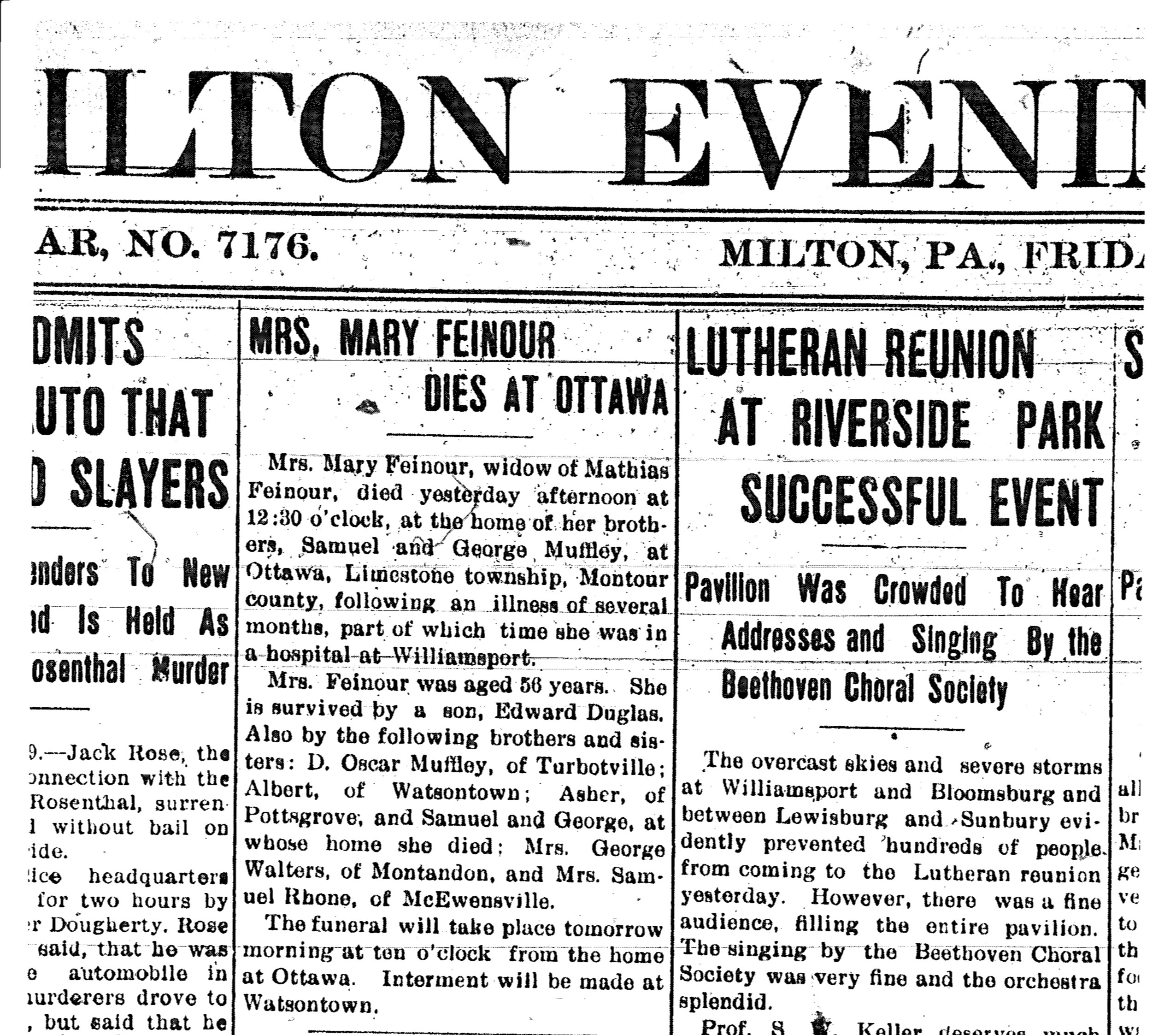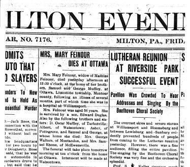 Mrs. Feinour was aged 56 years. She is survived by a son, Edward Duglas. Also by the following brothers and sisters: Dr.Oscar Muffley, of Turbotville; Albert, of Watsontow; Asher, of Pottsgrove; and Samuel and George, at whose home she died; Mrs. George Walters, of Montandon, and Mrs. Samuel Rhone, of McEwensville.