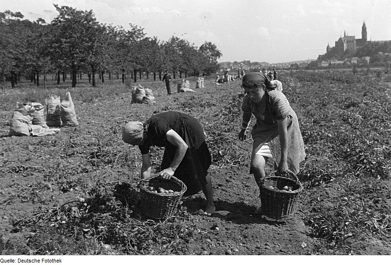 Harvesting potatoes in the German Democratic Republic in 1945. The country isn’t right–and the year isn’t right to illustrate this entry. But the picture does provide a sense of how much work it is to gather potatoes. (Source: Wikimedia Commons)