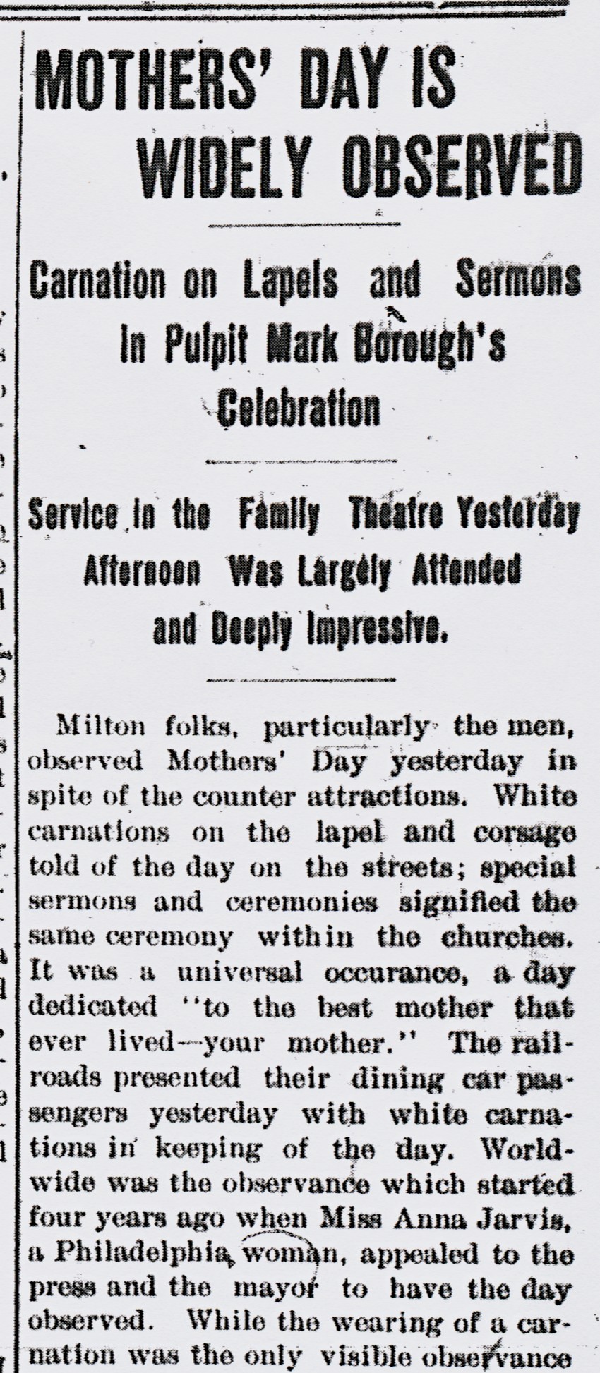 It’s surprising how quickly Mother’s Day caught on throughout the country. Grandma considered it important enough to mention in the diary in 1913—only 6 years after the first celebration of Mothers Day. And, the local newspaper, The Milton Evening Standard, had an article about it two years earlier.