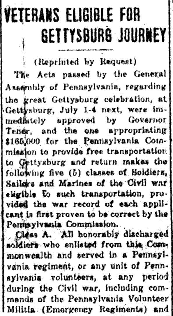 A month earlier there was another article about how the state of Pennsylvania would pay for the transportation costs of Civil War veterans who wanted to attend the huge anniversary celebration at Gettysburg.