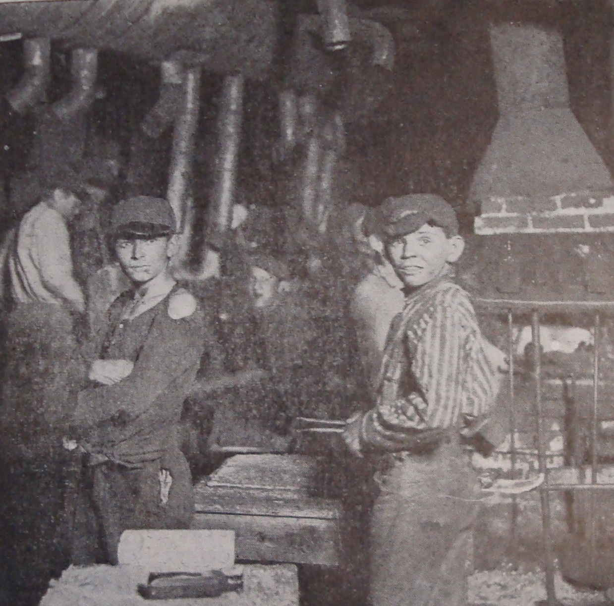 Photo caption: Midnight workers in a glass-factory. To the company, it is just a question of getting the work done at the lowest cost, and youth is ever cheaper than age. Some states have forbidden this.