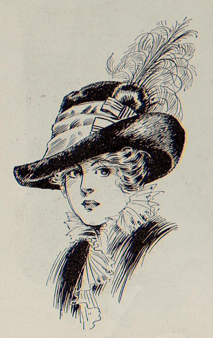 The hat of black velours, showing its simple original shape with a band of black grosgrain ribbon one inch wide. (Ladies Home Journal: September, 1913)