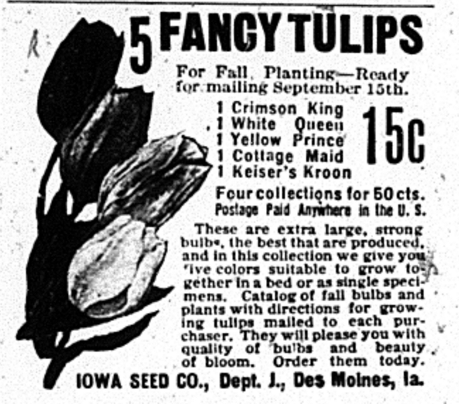 I found this advertisement for tulip bulbs in the September, 1913 issue of McCalls magazine. I wondered if I could buy these old varieties so I googled them. Here’s what I found: