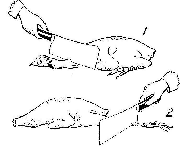 Separate the breast from back by cutting down both sides of bird below ribs. Remove heart, liver, gizzard, entrails and fat together. Remove windpipe, crop and lungs.