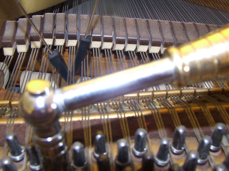 “A piano tuner’s most basic tools include the tuning hammer (lever) and mutes.”