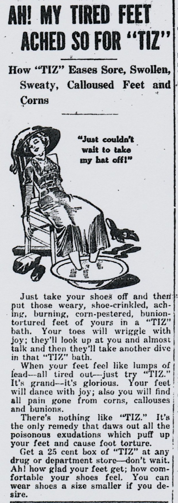 1. That is a hilarious advertisement! “weary, shoe-crinkled, aching, burning, corn-pestered, bunion-tortured feet”. But if my toes were to look up at me, I’d be very…..worried!