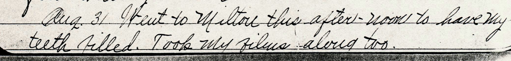 Monday, August 31, 1914:  Went to Milton this afternoon to have my teeth filled. Took my filius (?)  along too.