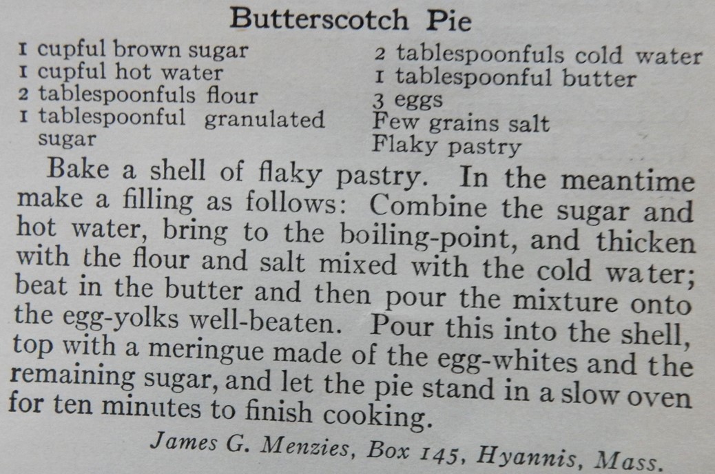People knew how to make lovely pies a hundred years ago. An old-time winter favorite was Butterscotch Pie with Meringue Topping. I found this classic recipe in the February, 1916 issue of Good Housekeeping.