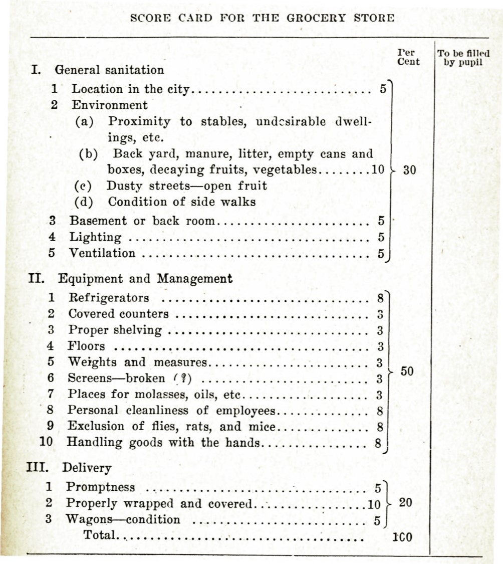 Similarly, a hundred years ago people also evaluated their grocery stores; but that’s where the similarities end. A hundred-year-old home economics textbook had a Grocery Scorecard that students could use to evaluate their grocery stores – but frankly I’ve never considered the proximity to stables, or most of the other old-time criteria.