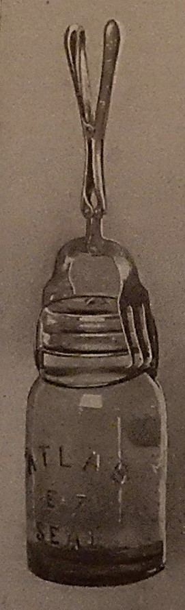 With its long vise-like fingers this device reaches down into the boiling water and lifts out the jars with safety.