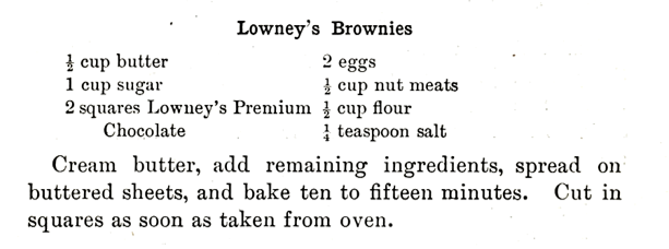 This recipe was one of the signature recipes in the old cookbook. Of course Lowney’s  Premium Chocolate is long gone, so I substituted unsweetened baking chocolate. I was also surprised that the recipe didn’t call for baking powder or baking soda – but the recipe turned out just fine without it.  I baked the brownies at 350° F. and it took longer than 15 minutes for them bake.