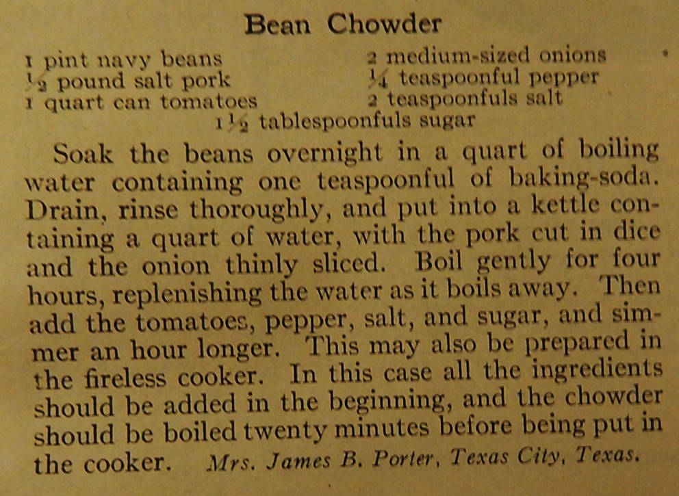 I am always cooking beans of some type and will have to try this version for bean chowder. Do you know what a fireless cooker is? Sounds like a crockpot!