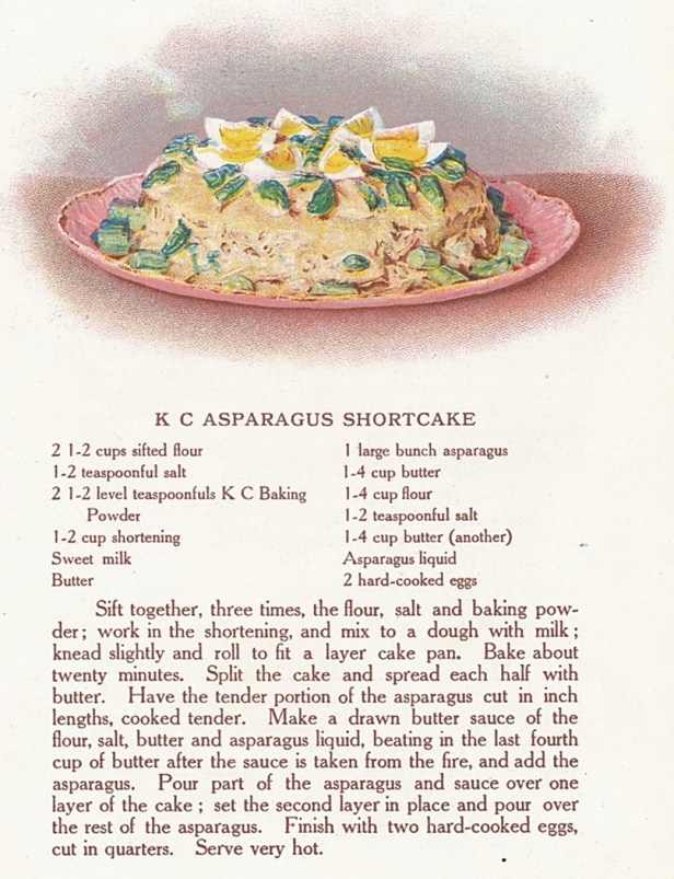 So  when I saw a colorful illustration for Asparagus Shortcake in a hundred-year-old promotional cookbook published by the KC Baking Powder Company, my curiosity was piqued. Was Asparagus Shortcake an example of a food that once had been at the “apogee of culinary chic”?