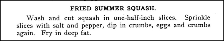 Today summer squash is often streamed or grilled, but once or twice each summer I fry it.  So I was thrilled to find a hundred-year-old recipe for Fried Summer Squash.