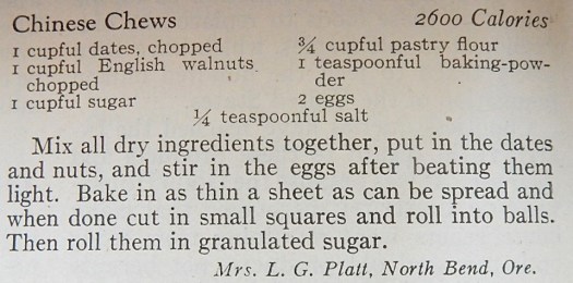 I recently came across a hundred-year-old recipe for Chinese Chews. The recipe was for walnut and date cookie balls. Why were they called Chinese? Were the balls supposed to seem special  because the name evoked thoughts of  exotic, far away places?  I think of the middle east when I think of dates – but not China.  That said, improbably named recipes inevitably intrigue me, so the next thing I knew I was making Chinese Chews.