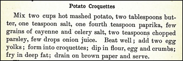 In any case, I ALWAYS have leftover mashed potatoes after holiday meals, so I was thrilled to find a hundred-year-old recipe for Potato Croquettes that calls for mashed potatoes. The Potato Croquettes had a crispy crust filled with a delightful spicy mashed potato mixture flavored with paprika, cayenne pepper, celery salt, parsley,  and onion.
