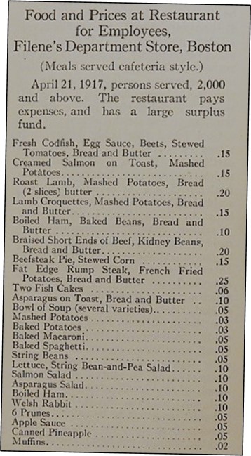 There’s been a lot of inflation over the past hundred years. A century ago, you could get a meal of roast lamb, mashed potatoes, bread (2 slices), and butter for only $.20 at the employees’ cafeteria at Filene’s Department Store in Boston. What would a similar roast lamb meal cost today?