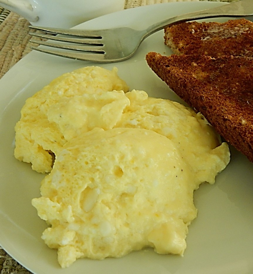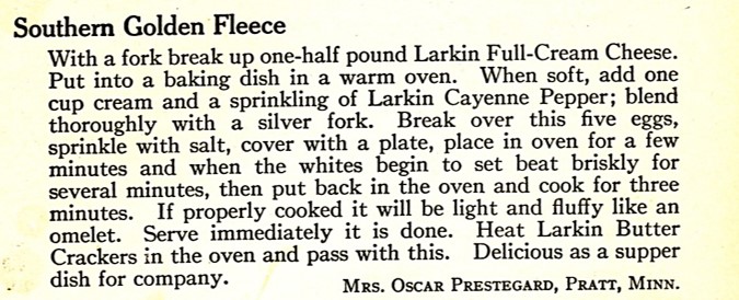 Scrambled eggs are always good, but sometimes when I make them for the fourth time in less than a month, they begin to seem boring – so I was thrilled to find a hundred-year-old recipe with a “new” twist and an intriguing name to boot.  Southern Golden Fleece is made with cream cheese and eggs, and is silky and rich.