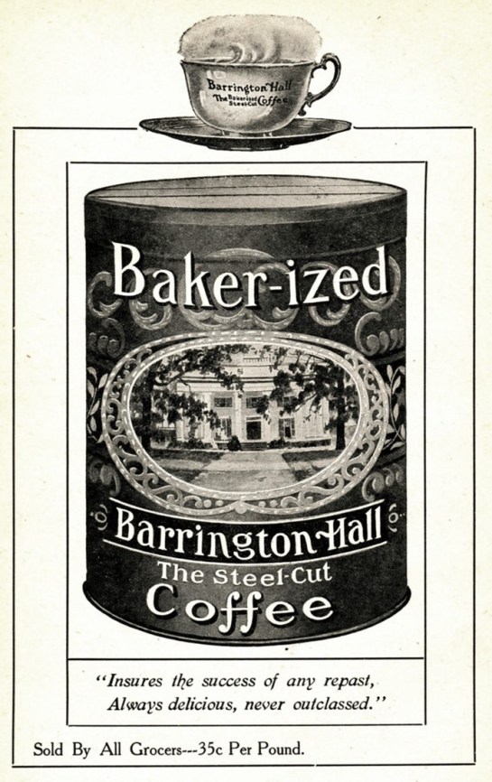 Sometimes I come across hundred-year-old advertisements for brands that have long vanished from the scene. For example, I recently found an advertisement for Barrington Hall coffee. According to the ad, it is “baker-ized” and “steel cut.”