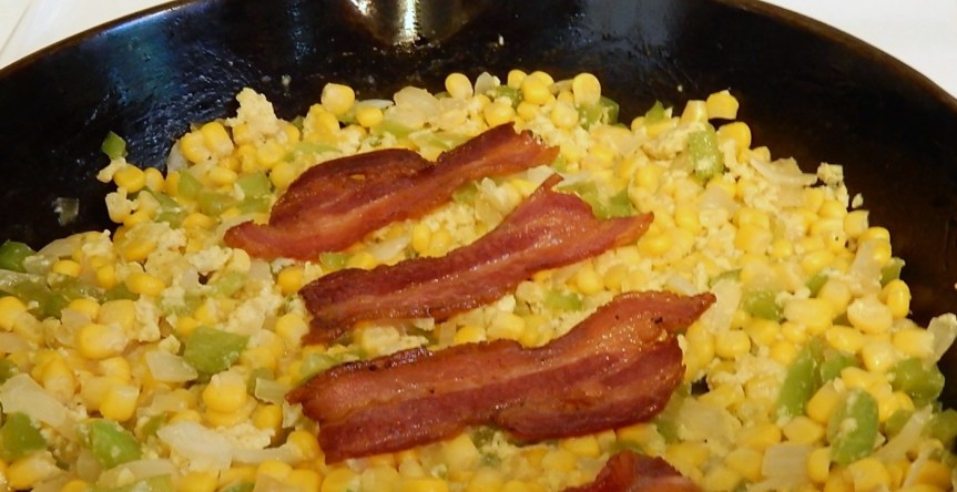 I’m always on the look-out for foods that are easy to make when camping, so I was thrilled to find a hundred-year-old recipe for Bacon and Corn, Camp Style. In addition to bacon and eggs, this dish contains eggs, green pepper, and onion, and is easy to make in a skillet. It is both hearty and tasty, and would be perfect for breakfast or dinner while camping. It also is a nice, easy dish to make at home.