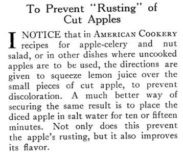 Did you ever hear of “apple rusting”? Apparently that term was used a hundred years ago to describe how apples tend to turn brownish after they are cut. Here’s what a 1918 magazine had to say about how to prevent rusting: