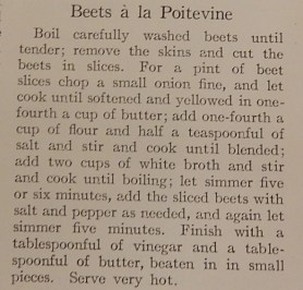 Beets are a tasty low-calorie vegetable, have lots of fiber, and are chock full of nutrients including vitamin B, iron, manganese, copper, and magnesium. But I often struggle to find good beet recipes. So I was thrilled to find a hundred-year-old recipe for Beets a la Poitevine. Beet slices are immersed in a light sauce that brings out the natural sweet goodness of the beets. At first I thought that this recipe might be similar to Harvard Beets – but it is very different. The recipe calls for no sugar, and only a minimal amount of vinegar which I could barely taste.