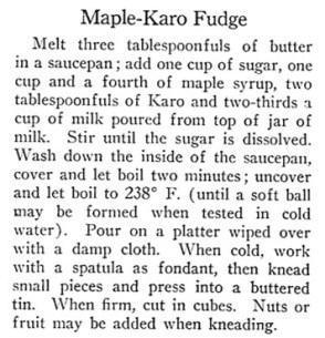 I love the flavor of maple syrup, so was thrilled to find a hundred-year-old recipe for Maple-Karo Fudge. I also was intrigued that the recipe called for Karo corn syrup.