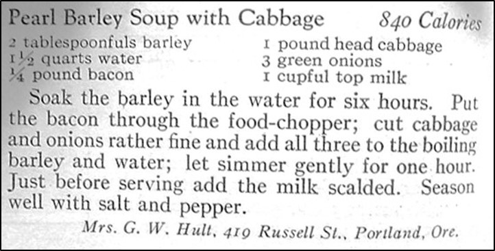 Soup is the perfect comfort food on these cold winter days. I recently found a wonderful hundred-year-old recipe for Pearl Barley Soup with Cabbage. The soup was delightful – but the recipe name is misleading. The recipe only calls for two tablespoons of barley – and it is not a predominate ingredient in the soup. This soup is really a hearty, rustic Cabbage and Bacon soup.