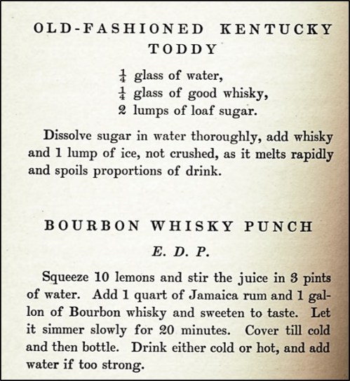 The one cookbook that I’ve found that contains numerous recipes for alcoholic beverages is a 1917 edition of a Kentucky cookbook called The Blue Grass Cook Book by Minnie C. Fox. The two recipes included in this post are from that cookbook.