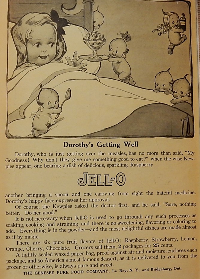 3. When I first viewed the illustration, I wondered what kind of creatures are tormenting that little girl? Then, upon reading the advertisement, I learned they were kewpies. I must say that my mother used jello as the go-to food when we were sick, but no matter