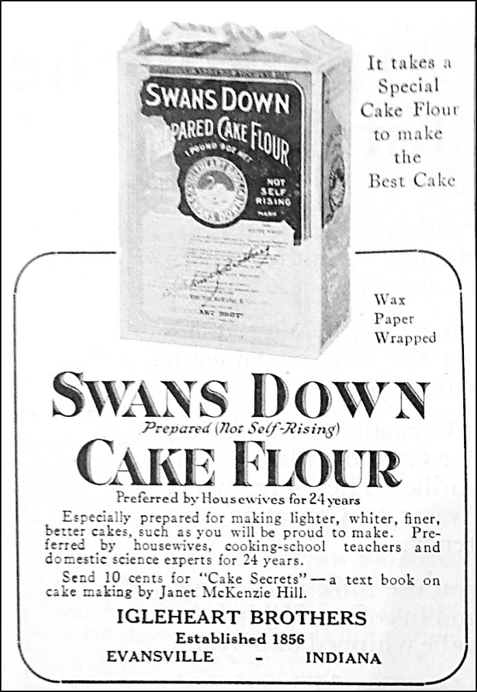 Old advertisements provide lots of information about which cooking ingredients were available at different periods of time – and they also sometimes provide information about how those goods were packaged. The waxed paper wrapper surrounding the Swans Down Cake Flour package was obviously seen as a key selling point in this 1919 advertisement.