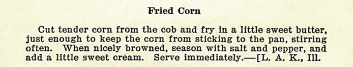 August is my favorite month when it comes to cooking and eating. Gardens and farmers markets are filled with a bounty of fresh vegetables and fruits at their prime – and, to me, corn on the cob is the quintessential August vegetable.Ā  But, I also am always looking for different ways to serve corn. So I was pleased to find a classic, very easy, hundred-year-old recipe for Fried Corn.