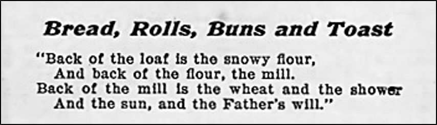 Old cookbooks sometimes have poems, such as this one in a 1919 cookbook. It was at the beginning of a chapter containing bread recipes. The poem lays out the path involved in creating a bread ingredient (flour). People were so much closer to agrarian life back then, and had a clear understanding of relationship between the weather, wheat production, the milling process, and flour. Would a similar poem resonate with cookbook users today?