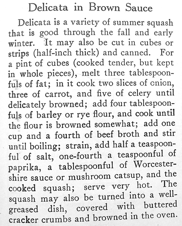 The century-old recipe was for Delicata Squash in Brown Sauce. The recipe called for cubed squash that is served in a delightful classic brown sauce.