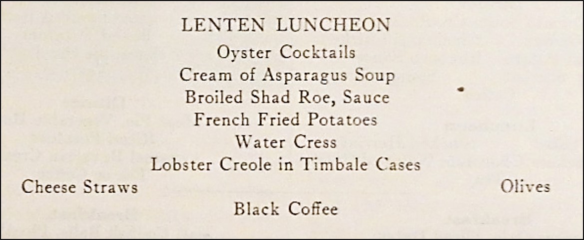 There’s been a history of giving up meat during Lent for a long time. I’m not sure exactly what was allowed a hundred years ago – and it probably varied depending upon someone’s religious and ethnic background – but this 1920 Lenten menu clearly suggests that it was common to eat fish instead of meat during this time of year.