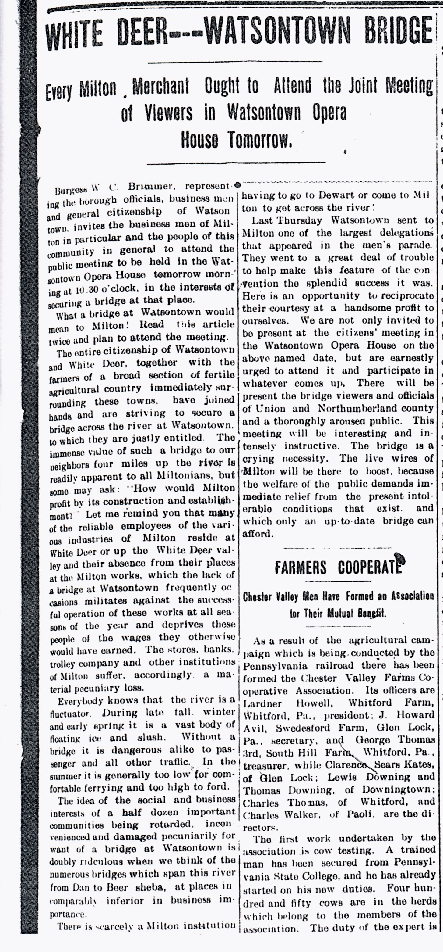 Watsontown was the medium sized town and where Grandma went a hundred years ago today. It was also about 1 1/2 miles from the Muffly farm, but in the opposite direction from McEwensville. Grandma often walked to Watsontown. It was to the west and is located along the West Branch of the Susquehanna River. It had a small downtown with a full range of stores where clothes, housewares, etc. could be purchased.