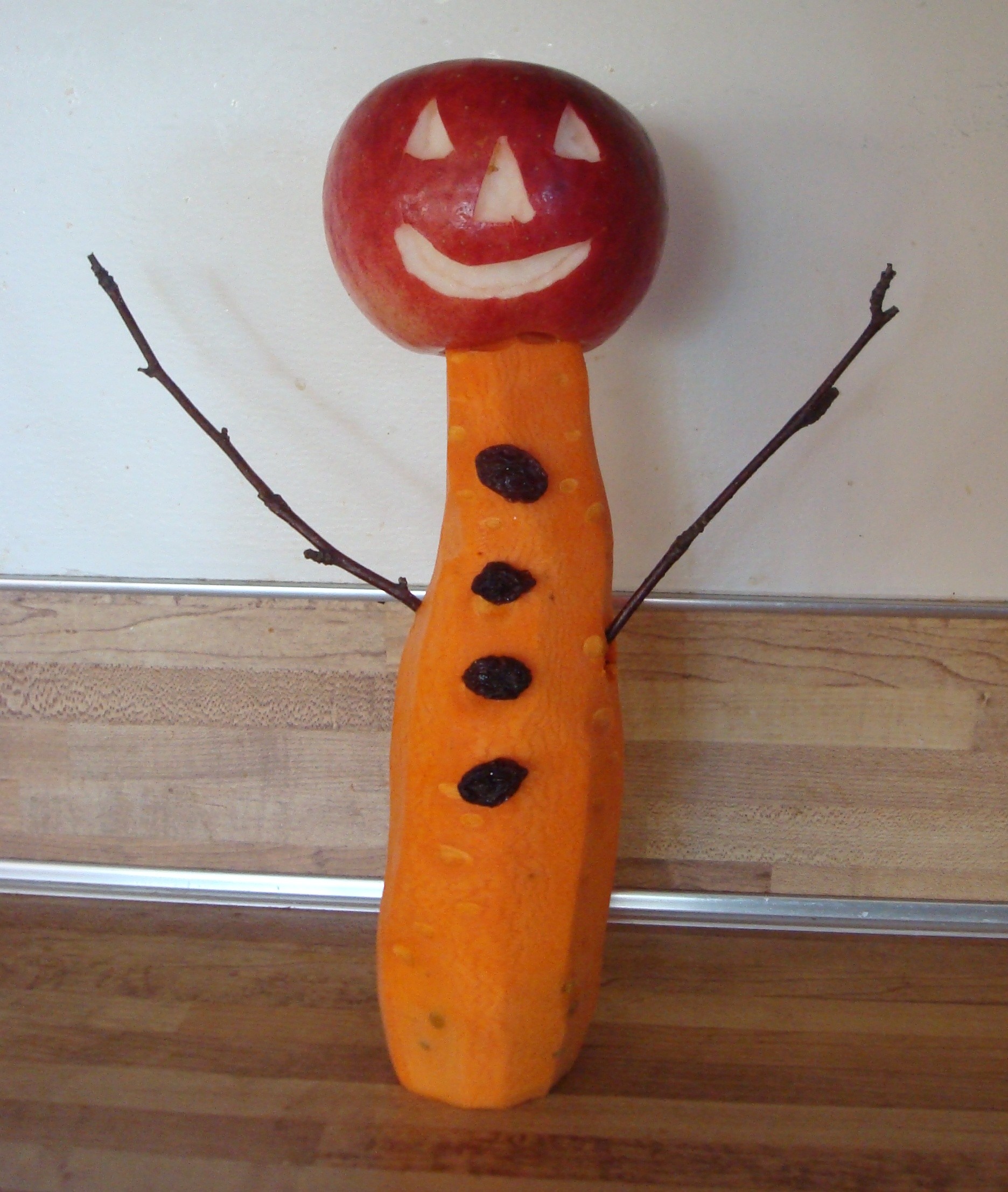 I then assembled the bogeyman. The “buttons” on the front of the carrot are raisins that I attached using pins.