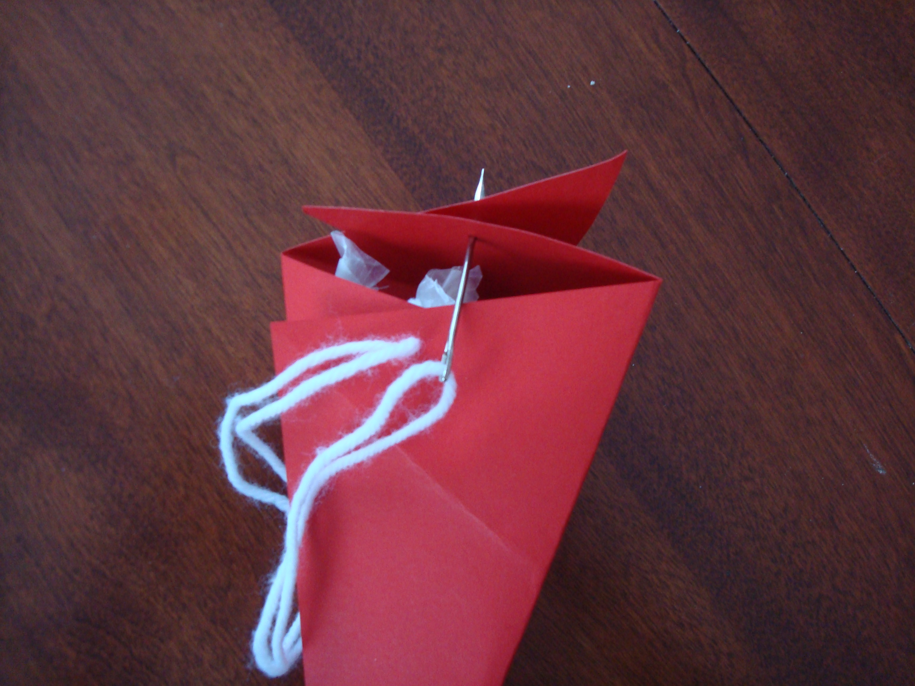 Fold the paper into the triangular shape. Thread a craft needle with yarn. Tie a knot at the end of the double strand, then pull the yarn through the two layers of paper to fasten them together. Fill with candy, then sew through the top of the box to close. Clip the yarn to remove the needle, and tie bow.