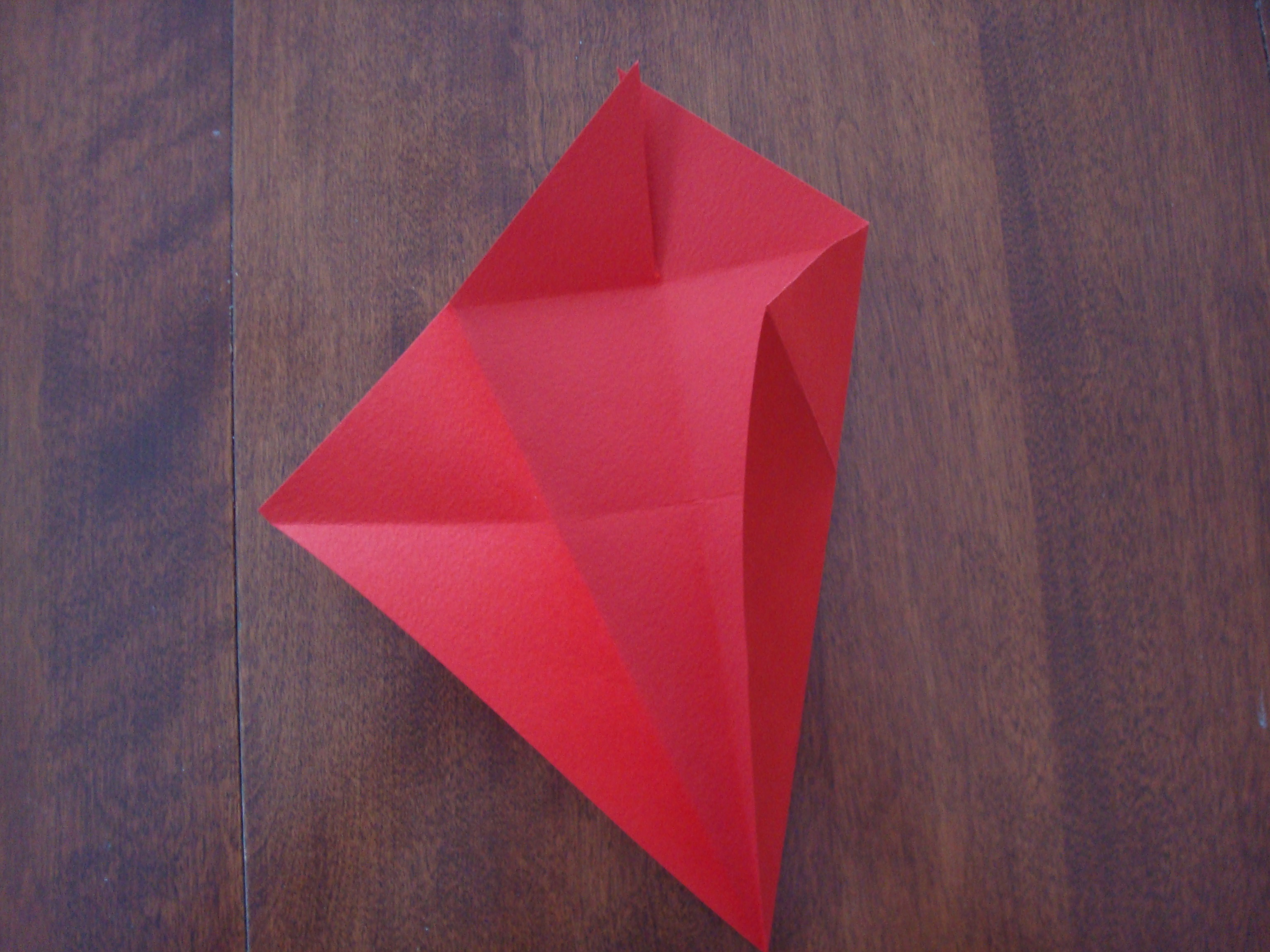 Bring a corner to the center of the paper and then fold. Repeat with the opposite corner.