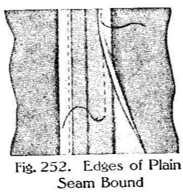 The bound seam is used to finish joinings in dresses or skirts of heavy material and is made by binding the edges of an ordinary seam with seam binding which comes for this purpose.